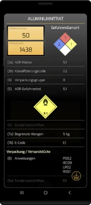 Die intuitive Benutzeroberfläche ermöglicht eine blitzschnelle Recherche: Ob Sie nach einer spezifischen Gefahrstoffnummer (UN-Nummer), einem Stoffnamen oder einer Gefahrnummer (Kemler-Nummer) suchen – die benötigten Informationen sind nur wenige Taps entfernt. Auch die Suche nach ERI-Cards ist direkt integriert. Praktische Funktionen wie der PDF-Ausdruck wichtiger Dokumente, die Erstellung von Ladelisten und die umfassende Darstellung aller europäischen Straßentunnel inklusive ihrer Kategorien erleichtern den Arbeitsalltag erheblich. Zudem sind die Einstufung und zusammenfassende Kennzeichnung (GHS) jedes Stoffes klar und verständlich aufbereitet, ergänzt durch Zugriff auf alle europäischen ADR-Anweisungen (Internetverbindung erforderlich).